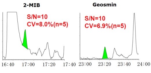 以下将以水中霉味为例,说明trap mode顶空法高灵敏度的特点。由于霉味产生的物质 2-甲基异莰醇(2-MIB)和二甲萘烷醇(Geosmin)通常是 10ppt 极低的浓度含量,传统一般的顶空法是很难检测出来的。