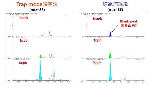 图五 trap mode 顶空法与吹气捕捉法的比较
