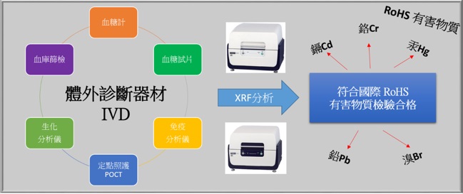 于今年起,体外诊断器材(In Vitro Diagnostic Medical Devices)需开始检验产品是否含有铅、镉、汞、六价铬、多溴联苯以及多溴联苯醚等六种有害物质,若无相关检验报告将无法进入国际市场,因此厂商们今年直接的问题将会是:「我的产品出口至国外,生意是否因此受到影响?」、「我们尚无检验分析能力,是否因此流失客户?」、「要如何做才能确保我的产品符合RoHS物质检验标准?」
