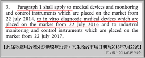 2016年对于国际间之体外诊断器材厂商是特别的一年,由于欧盟颁布之有害物质限用指令RoHS (Restriction of Hazardous Substances )中提到,体外诊断器材(In Vitro Diagnostic Medical Devices)将于今年七月二十二日开始生效